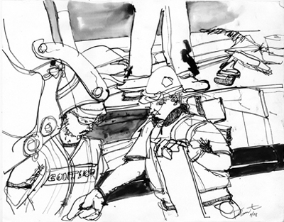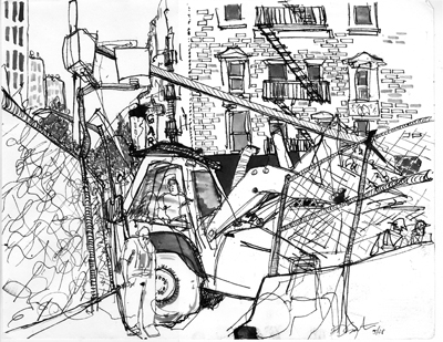 On the May afternoon I drew these two illustrations, crossing the block was a bit tricky. East to west the crosswalk was blocked by the backhoes bringing in dirt from a pile on Second Avenue and north to south the front end loader stopped pedestrians as it scooped dirt from another pile on 94th. The guys in the ditch felt more like gravediggers than construction men. I kept feeling like if the lone guy who was orchestrating the loads from both directions looked away the two in the ditch would permanently be a part of the new T Line. With every load they got a little higher and finally walked right out of the hole, after burying the new pipes below the surface. I can only assume that the next few days would find a similar process happening in front of Nick’s as they reworked the utilities in that trench and filled it in.